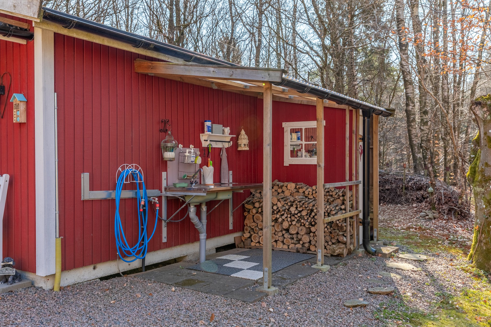 Stuga 2: Uppförd av PEAB-skolan i Ängelholm 2015. Grund: gjuten platta. Fasad: stående träpanel. Stomme: Trä. Tak: Papp. Fönster: 2-glasfönster